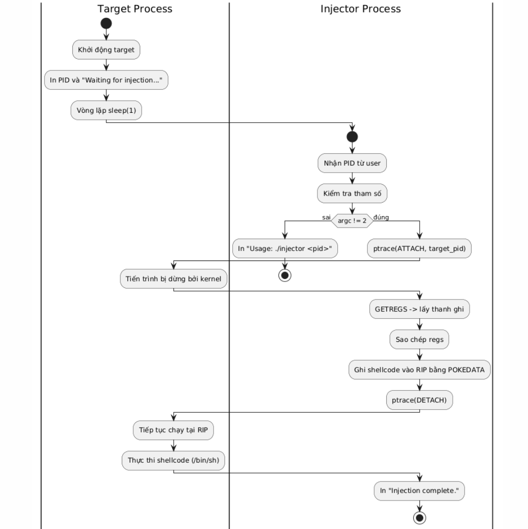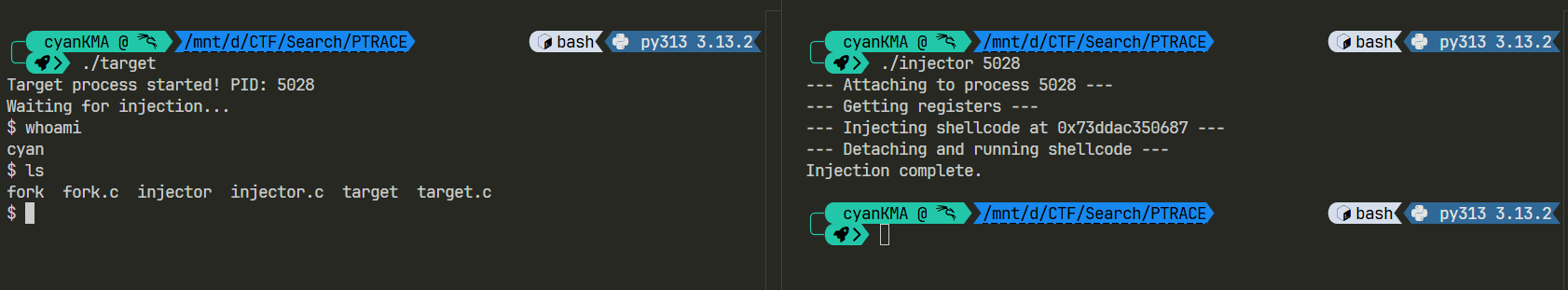 Tab terminal 1 khởi chạy target để lấy PID, terminal 2 chạy injector với PID của target để tiêm shellcode và thực thi.